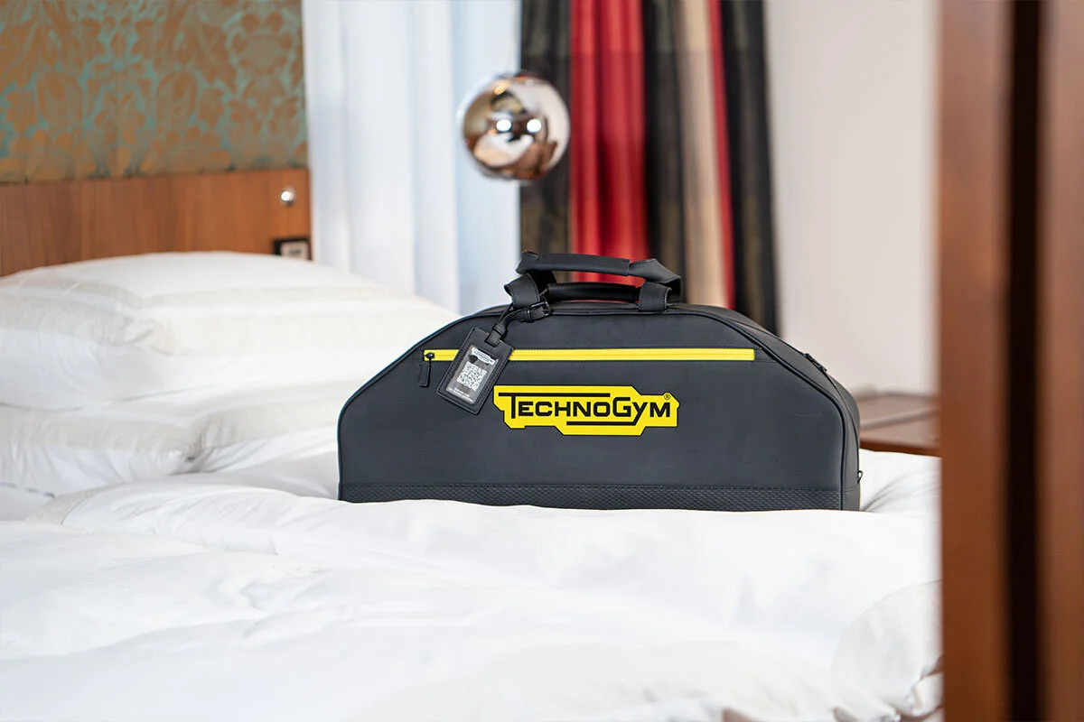 Another exciting option for a training session while travelling is the Technogym Case – a full solution featuring a smart range of tools, functionally packed in a high end design bag and completed by a library of training video contents, for a seamless guest experience. The tools inside the Technogym Case were designed to help guests recover and feel good after a long trip, with the QR Code on the tag attached guests can also enjoy a guided workout with a brand new virtual trainer on their phone or mirroring it in the room TV for a better experience.